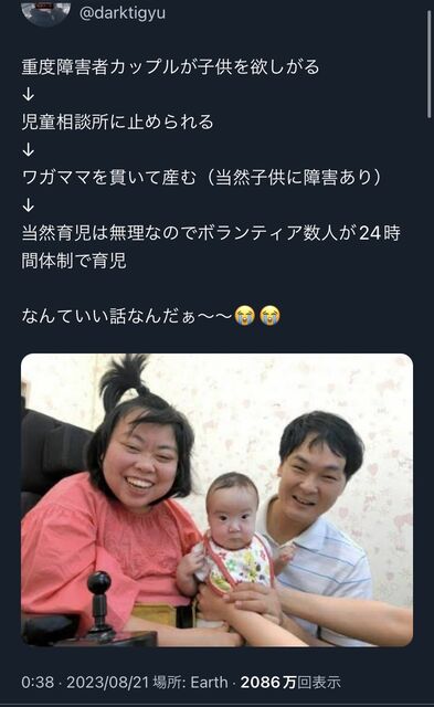 障害あるのに産むバカとそれをよしとする頭チ〇コ野郎のせいで不幸の生産が終わらない