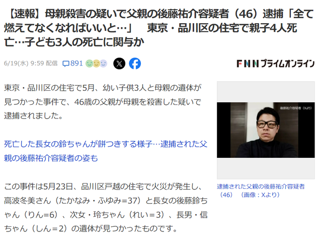 高波さんは介護施設で働いていたが、体調不良で休職していた。後藤容疑者は在宅で動画編集の勉強をしながら、子育てにも積極的に関与していたとみられる。近隣住民は「子煩悩なパパだった」「仲の良い家族だった」と口をそろえる。