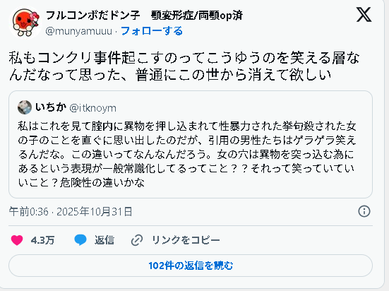 >>3の女さんによるとこういうの笑える層はコンクリ事件起こすらしいで