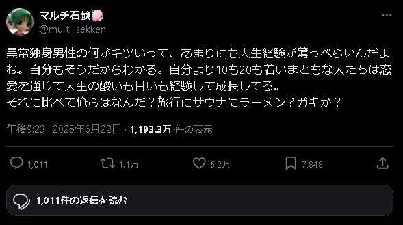 異常独身男性の何がキツいって、あまりにも人生経験が薄っぺらいんだよね。自分もそうだからわかる。自分より10も20も若いまともな人たちは恋愛を通じて人生の酸いも甘いも経験して成長してる。