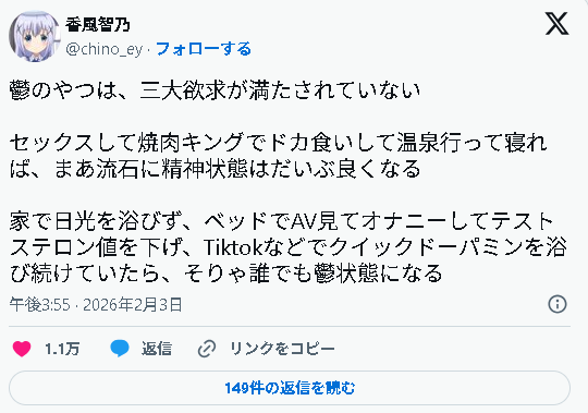 鬱の人はセッ〇ス温泉焼肉してないからダメなんだよ、だから鬱になるんだよ